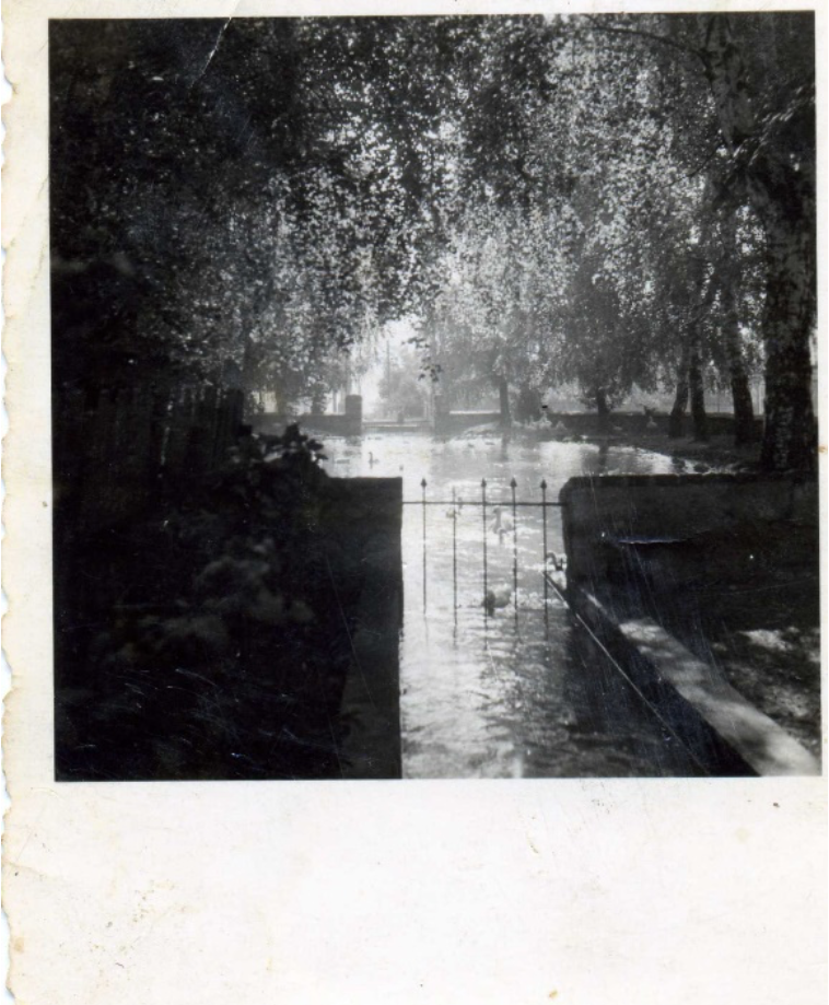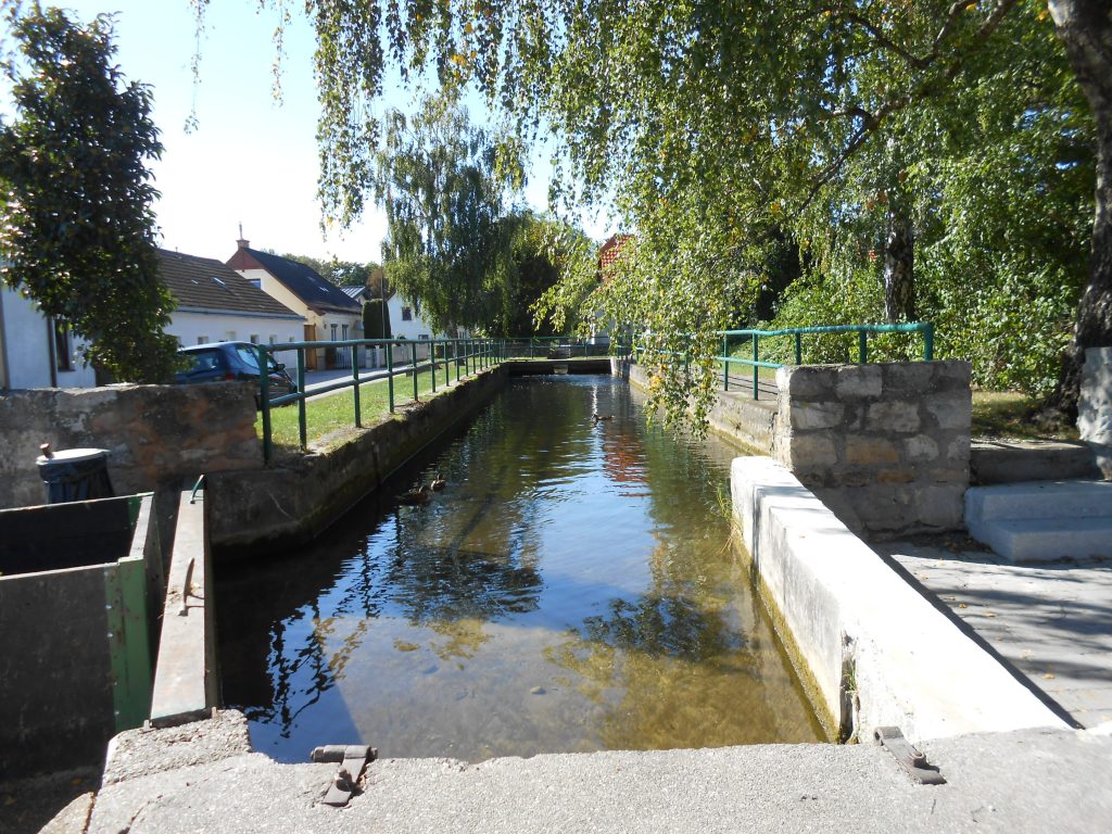 Bis hierher zum Teich hat es einen 5,3 km langen Weg hinter sich, in dem auch die Abteilung der Nachtkanäle und die Abzweigung in die westlichen Viertelkanäle kurz nach der Bahnbrücke liegen.