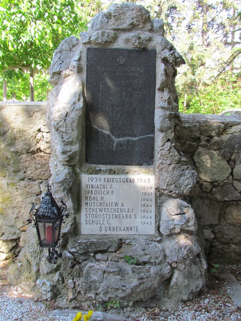 Links neben dem Eingang befindet sich das Kriegsgrab, das nach dem 1. Weltkrieg für gefallene Soldaten und andere Kriegsopfer errichtet wurde. Auf Initiative des Russland-Heimkehrers Robert Sohm (1947), wurde es renoviert und erweitert für Opfer des 2. Weltkriegs. Zu Allerheiligen 1952 erfolgte die Einweihung.